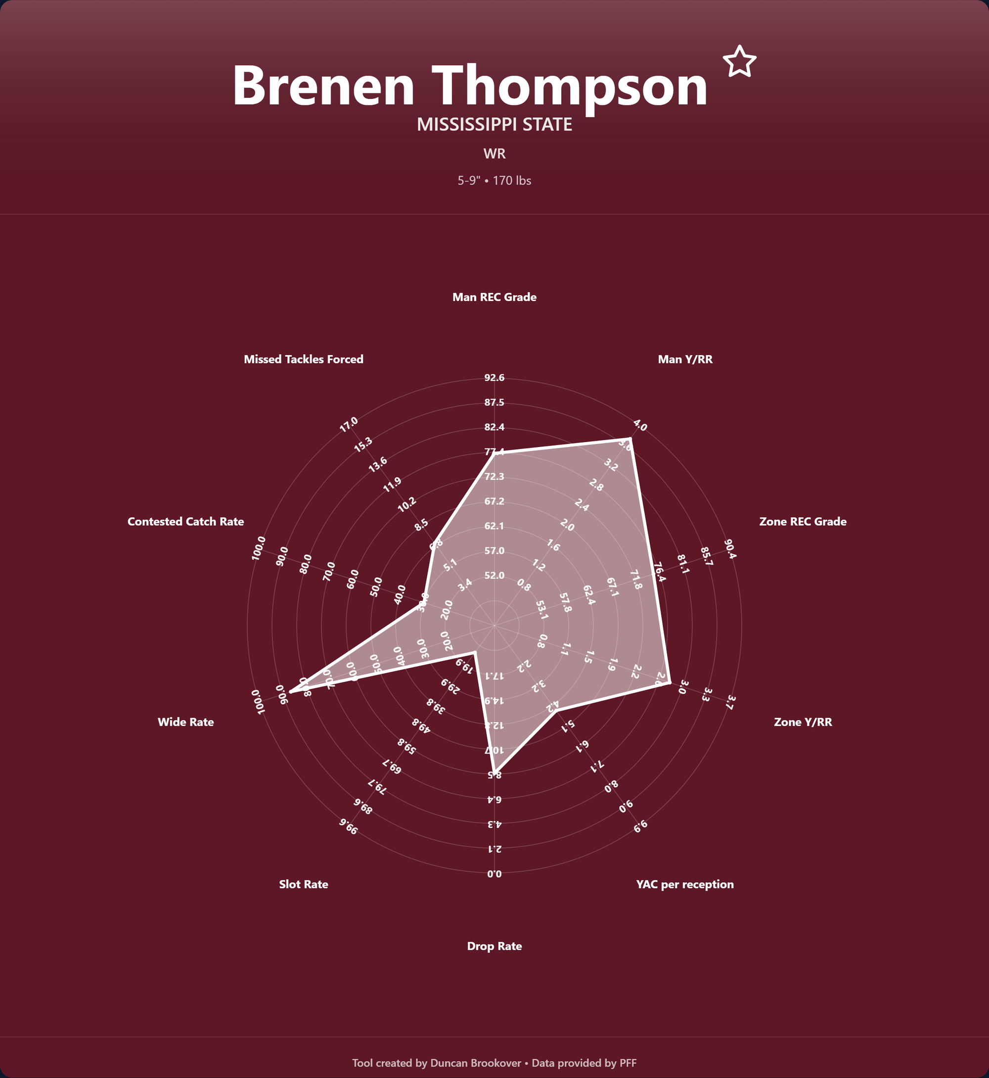 Brenen Thompson is different. His speed is a PROBLEM. There is not a soul who can keep up with him on the field, and very few who even have a hope of staying nearby. Right there, his floor is an elite field stretcher used in the couple of situations a team tries to take the top off every game.