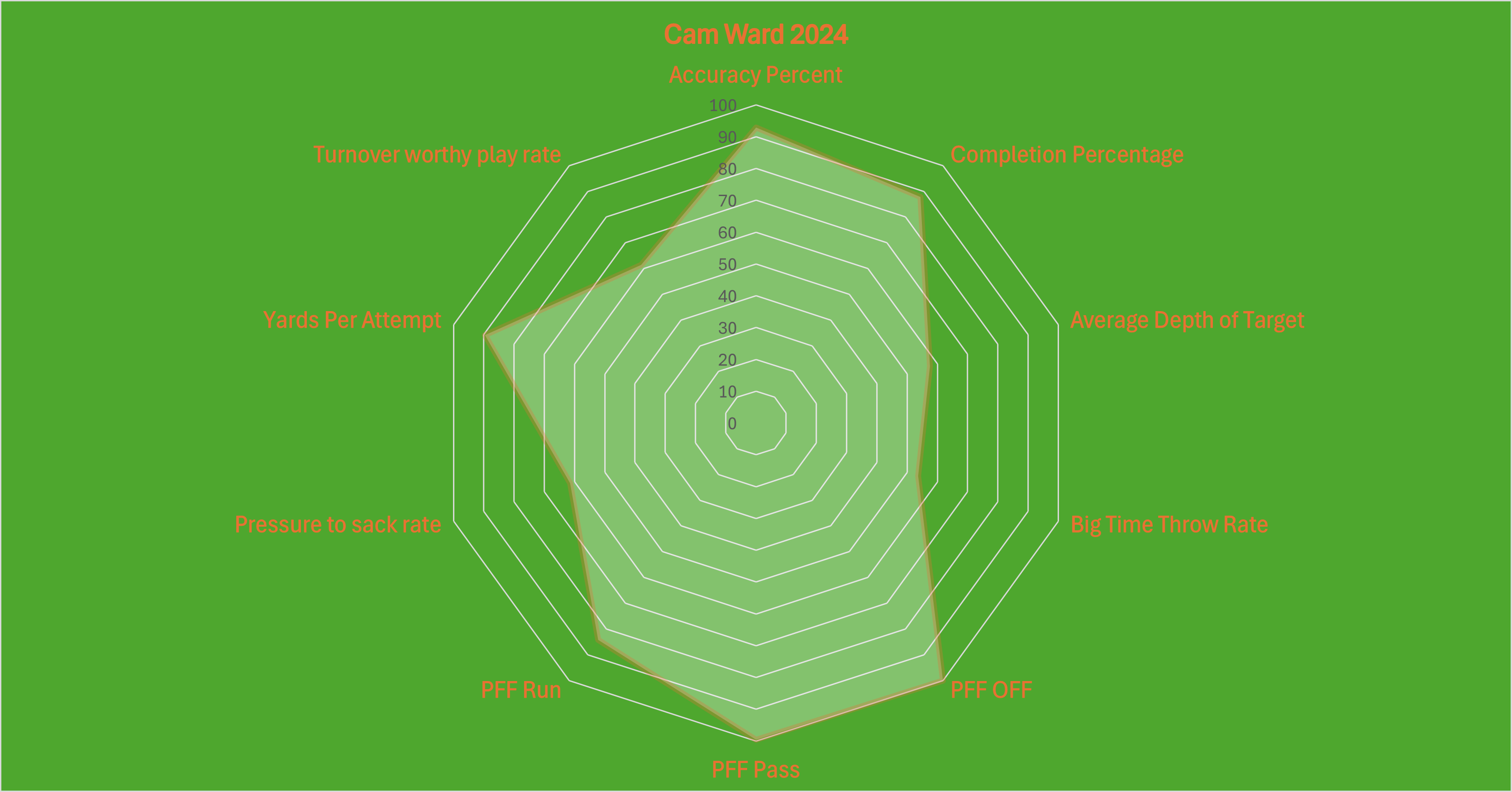 PFF had Klubnik ranked as their QB10 in OFF last year, and it is not hard to see why. He can make every throw on the football field that you would want someone to make. With his strong arm, he excels at throws deep down the field. PFF gave him the 10th highest passing grade of any quarterback in throws 20+ yards down the field, and he was tied for 2nd in the number of big-time throws he had last year. Much of that can be attributed to his consistent throwing base, quick release, patience, and toughness. His ability to throw the boundary go ball, and his trust in his receiver to go and grab it is one of my favorite parts of his game. I wish he put just a bit more loft on his deep balls. That's to be expected of someone more reliant on a fastball, but he has shown the ability to do it at times.