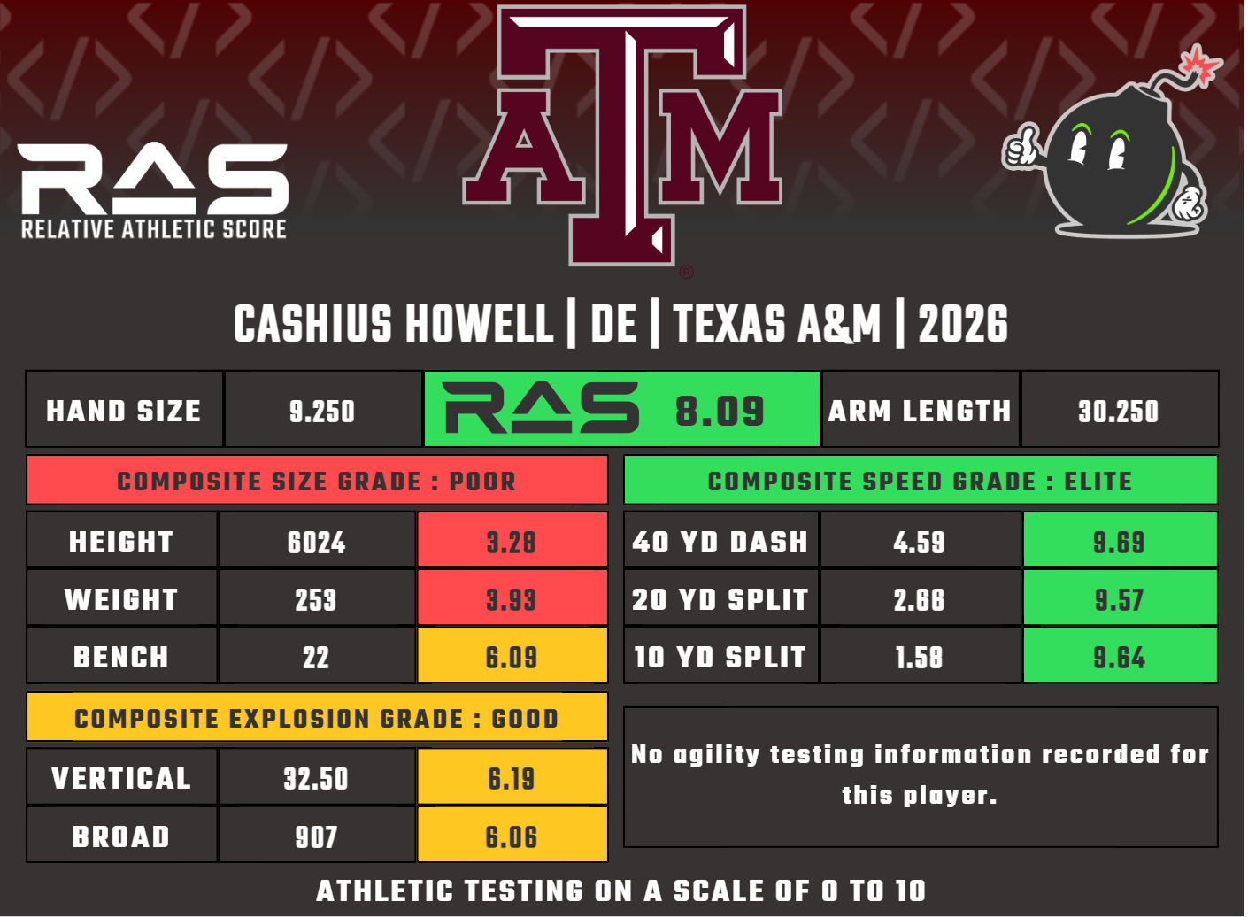 Cashius Howell grew up in Kansas City, Missouri, attended Rockhurst High School, where he carried a 3.6 GPA and set a school record with six sacks in a single game as a junior, and graduated without a single power conference offer, committing to Bowling Green. As a redshirt sophomore in 2023, he topped the MAC with 9.5 sacks, then transferred to Texas A&M, spending his initial Aggie season rotating behind future NFL draft picks Shemar Stewart and Nic Scourton. He broke out in 2025 with 11.5 sacks, the most by an Aggie since Myles Garrett in 2014. The SEC named him Defensive Player of the Year, and he earned unanimous All-American honors before declaring for the 2026 NFL Draft.