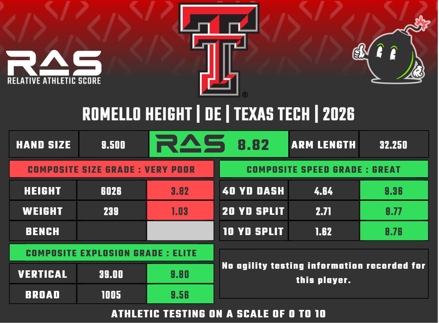 And I mean nothing more. Height offers next to nothing in the run game outside of backside pursuit. Coaches removed him from short-yardage situations that would favor the run all the time. Taken out in college. Not the pros; they know he cannot offer anything to the college-run defense. That's bad, even on a stacked roster like Texas Tech's.