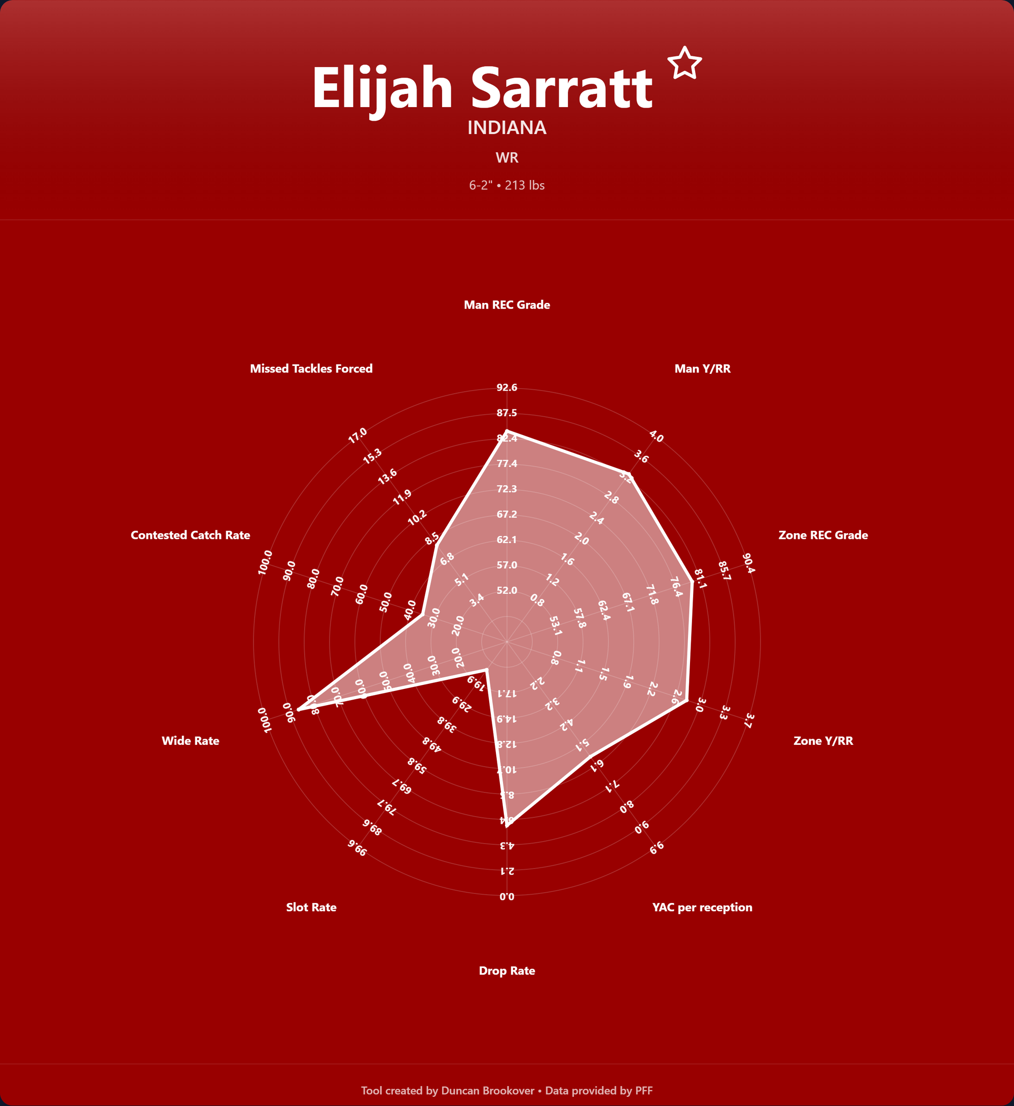 Usually WRs with physical limitations like Sarratt struggle to separate in man. He does not. He is always playing at the top level his athleticism allows. The speed he carries in and out of breaks shows almost no difference, while others take a second to get back up to speed. He continues to show that speed with the ball in his hands, but without that extra gear, he is only solid at finding YAC, but always falls forward.
