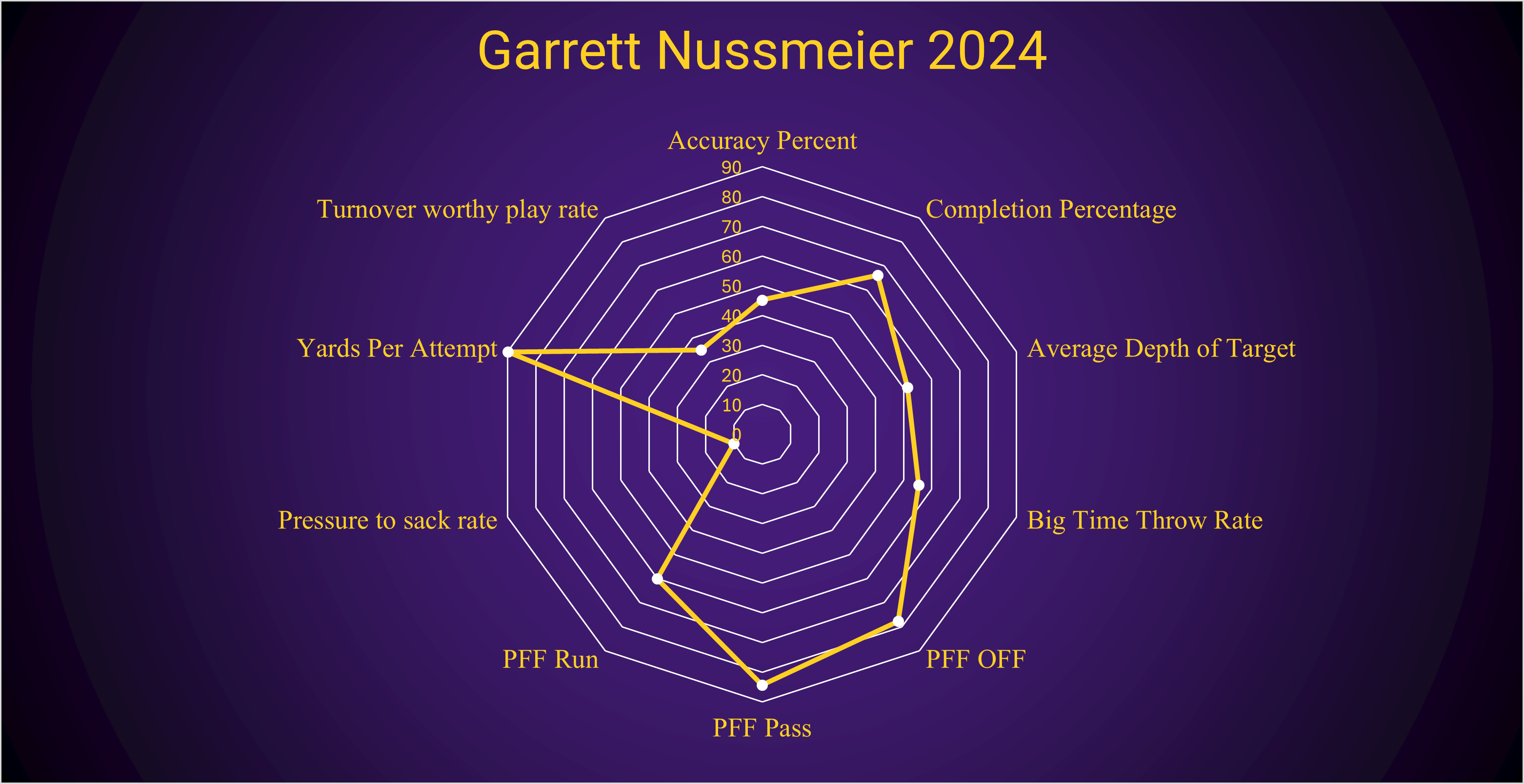Before I go back to how Nussmeier benefited from where he played, I have to point out some of the downsides as well. LSU threw so many screens. So, so many screens. The second most popular play to screens seemed to be Nussmeier's play-action boot to the right, where he could find a receiver anywhere from the line of scrimmage to ten yards downfield. The number of those plays would hurt anyone’s average depth of target. Though to go back, Nussmeier did not do himself any favors in that department. He works through his progressions well, but a lot of the time, he moves on a touch too quickly. This led to a truly insane number of check downs, which are not bad plays within themselves, but he is too often looking for his safety blanket. This approach is the main reason his turnover-worthy play rate is low. Add to that elusive RBs and WRs, and now it makes sense that his ADOT is low, but his yards per attempt are so high—the benefit of playing for LSU.