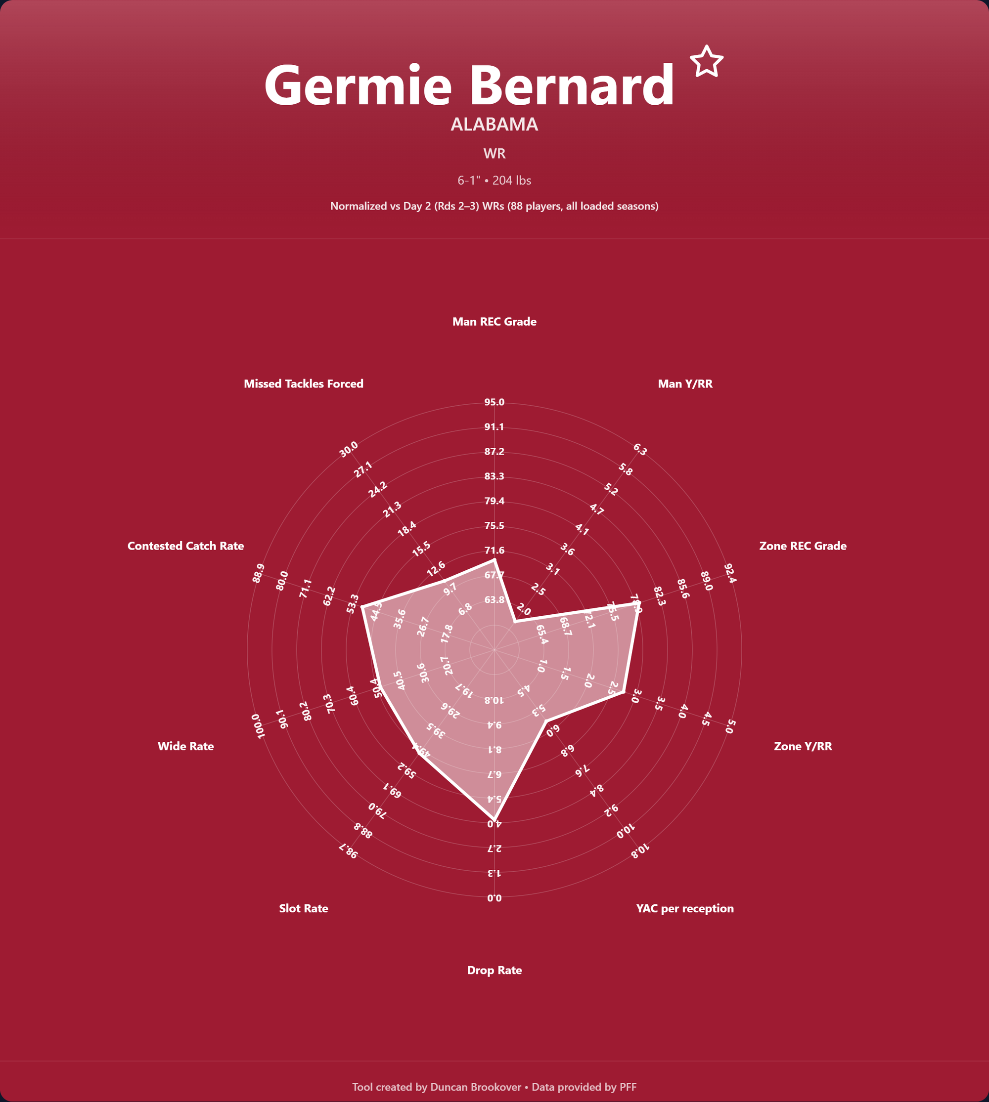 Germie Bernard has decent size for a WR prospect. He is 6'1" and weighs 206 lbs, both in the upper third of all WR measurements at the combine. The rest of his combine testing is, well, odd. I'm not sure if his undisclosed injury played a factor, but he has a very solid broad jump combined with a very poor vertical jump. Even his 40 was weird with an excellent 10-yard and full 40-yard split, but his 20-yard split was just good. That weirdness also shows up on tape, but the only thing not shown at the combine is his excellent play strength and contact balance that make him a genuine threat with the ball in his hands.