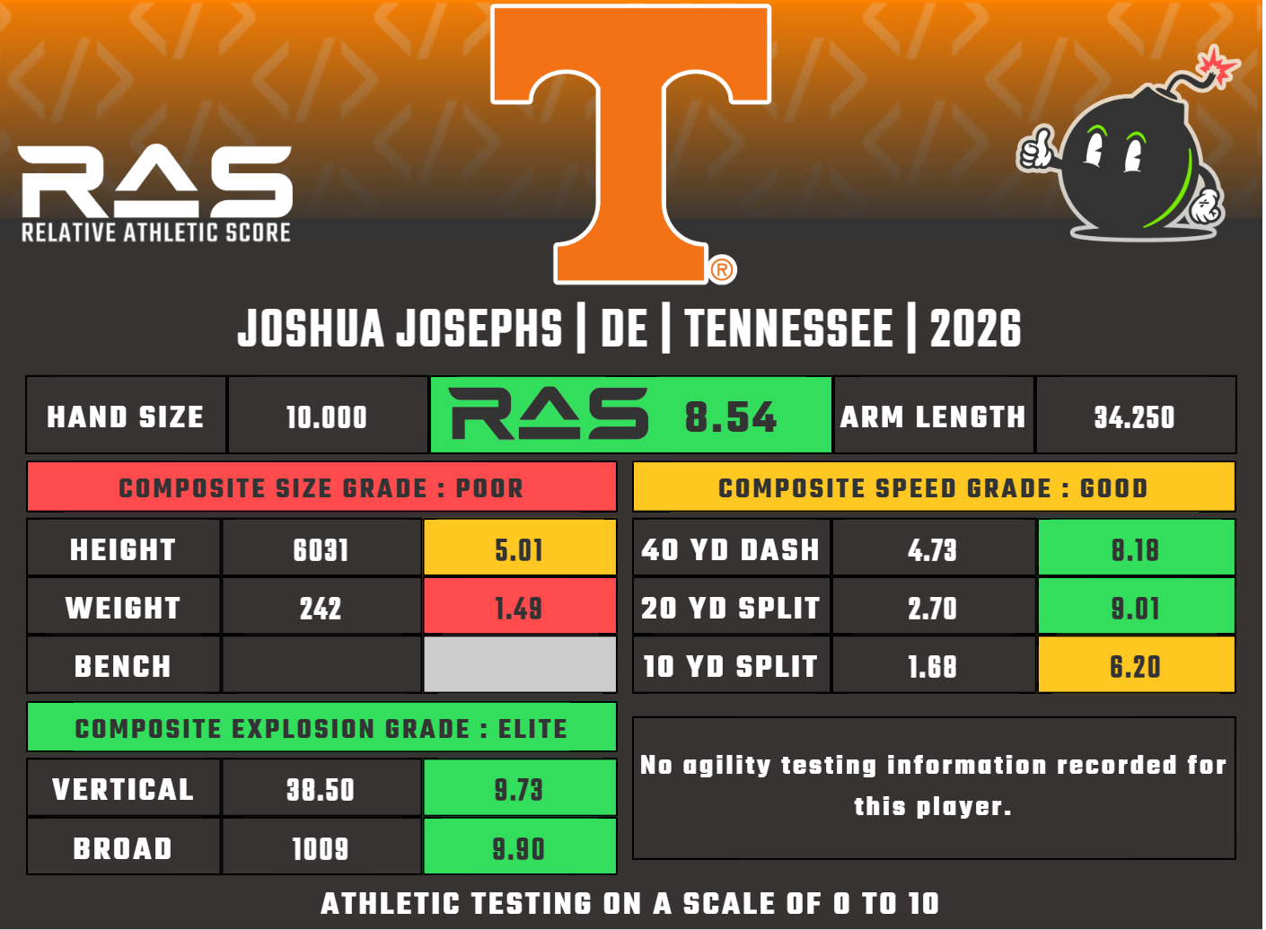 For his stature, Josephs has extremely long arms. 34.25" arms rank in the 79th percentile for all drafted EDGEs in the MockDraftable database. He combines those long arms with decent speed, and first step explosion that help him fire to ball carriers.
