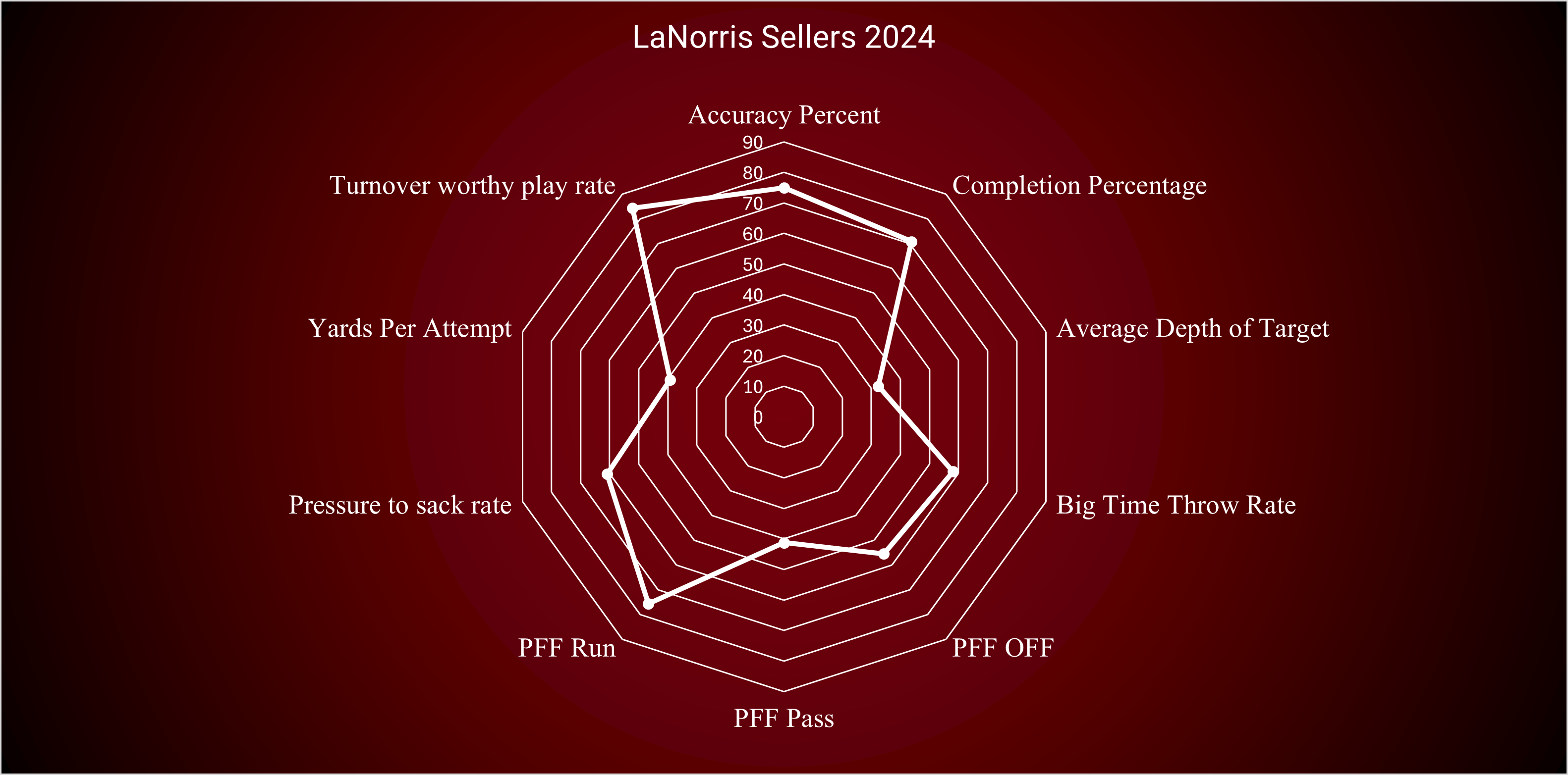 This was a little bit harder to evaluate from a tape perspective, as I did not see a lot of NFL transferable throws in the South Carolina offense. Now, is that because Sellers cannot do it, or is that just the design of the offense? I would not be surprised if it were a bit of both. It looks like PFF thought the same with their 66th overall rating in OFF, a 55th percentile finish for QBs in 2024. If you watched Sellers’ highlight reel, you wouldn’t believe he could be that low.