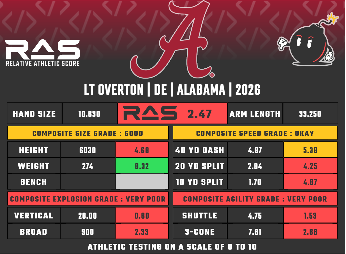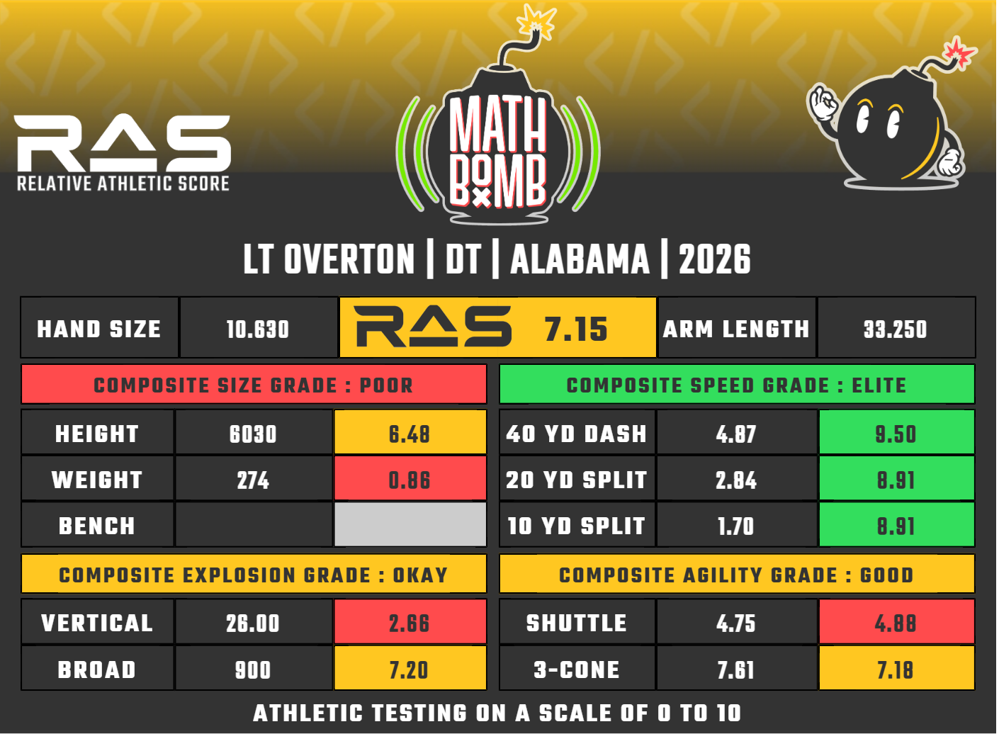 I hate this. I dislike being low on prospects who other people have much, much higher, because I feel like I am missing something. My grade is based entirely on what he could offer as more of a DT style player that someone should convert Overton into. If The Beast by Dane Brugler comes out later this week and flags his medicals as a concern, I reserve the right to change this grade to a 2.4 (a priority undrafted free agent).