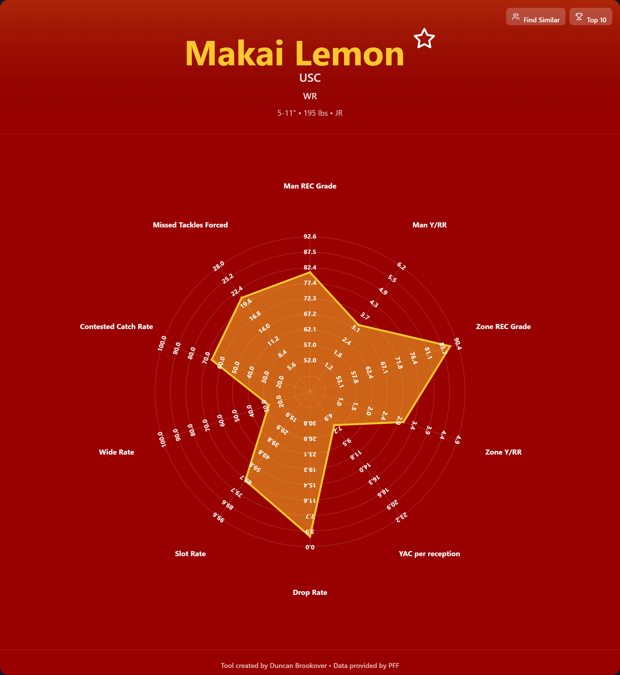 Makai Lemon is a very good prospect, and while I mentioned above that being a primarily slot reciever is not the death knell it used to be, it is still a major hindrance to performance. Of the top 30 receivers from 2025 by PFF grading, only seven had slot rates higher than 50%. If he had shown the ability to do that in the NFL, I would be raving about him, but for now I remain with questions that have to bring him down my board, and behind consensus.