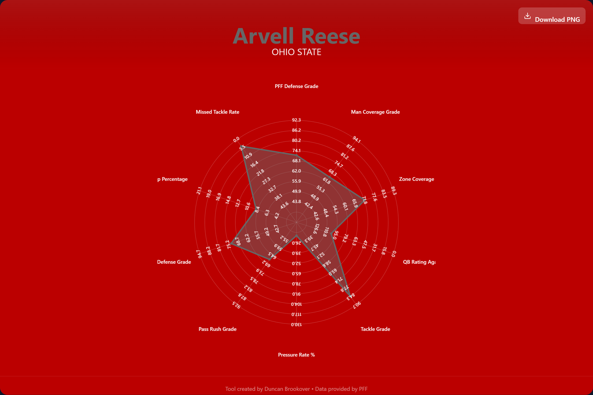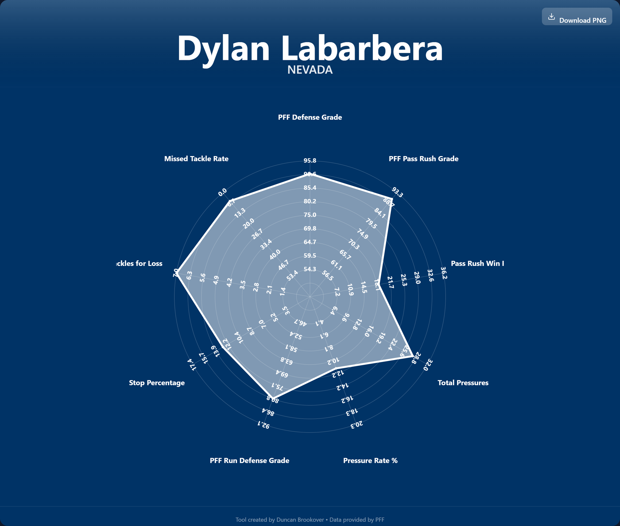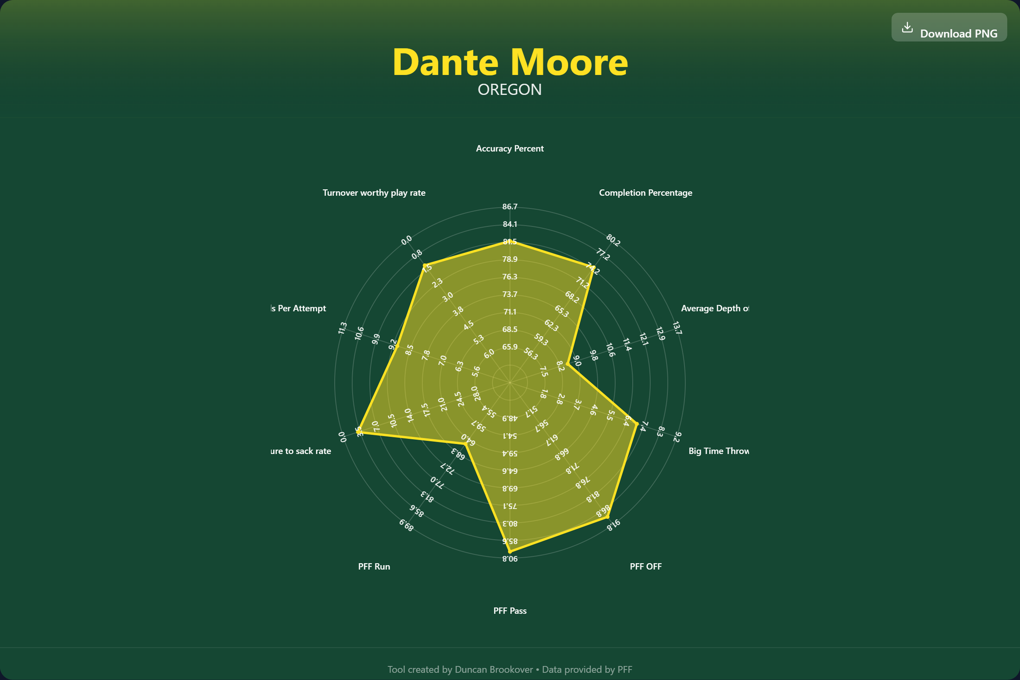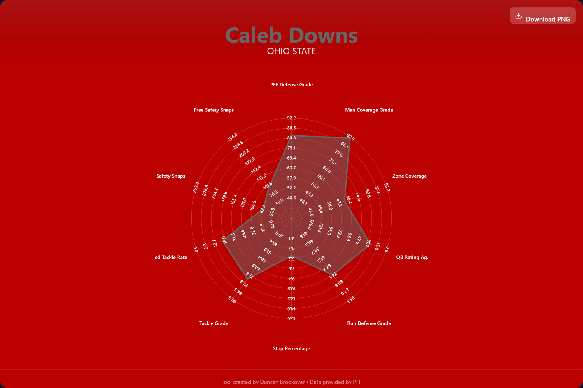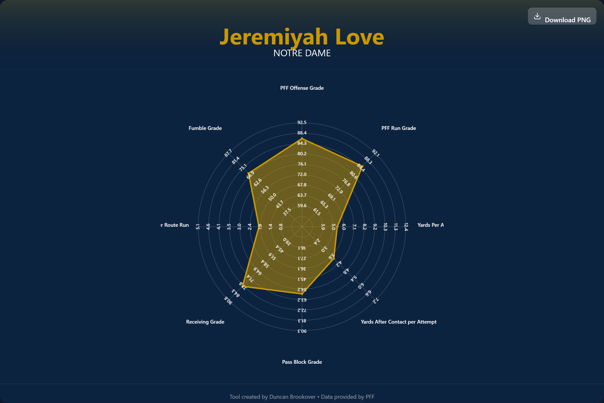I have been waiting for this moment for a while, where it seems like two things are finally coming together. 1.) We finally have enough games under our belt to begin to draw data driven conclusions on how some prospects look this year. 2.) I have built a tool that makes the process of making radar charts quicker, and more accessible to all! You do need access to PFF premium data for it to work properly, so if you do feel free to check it out.