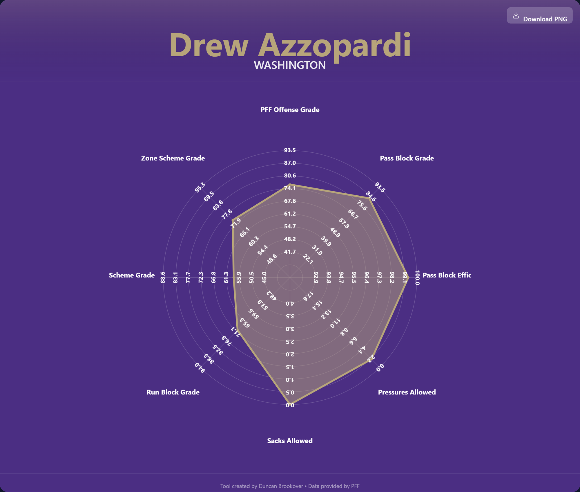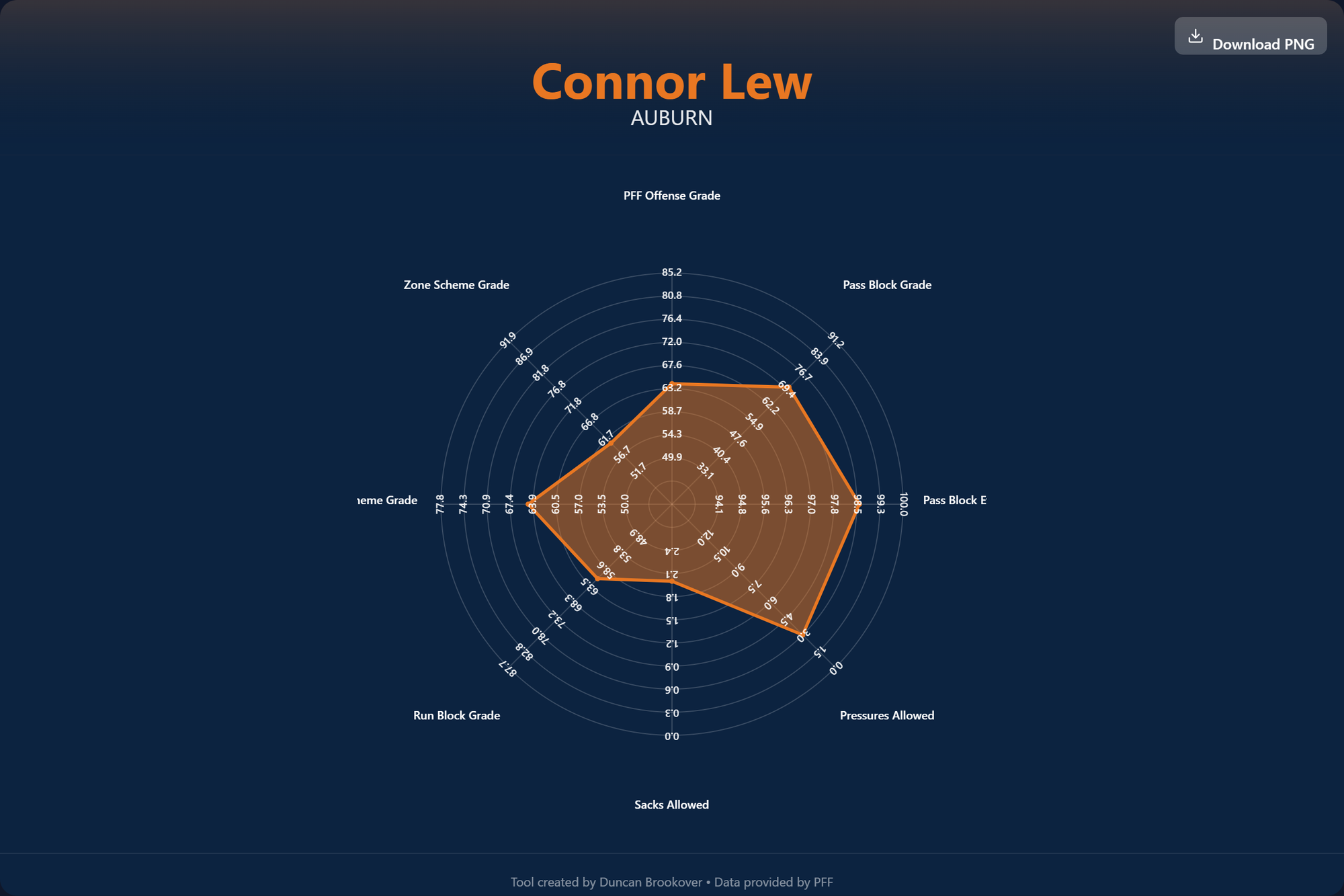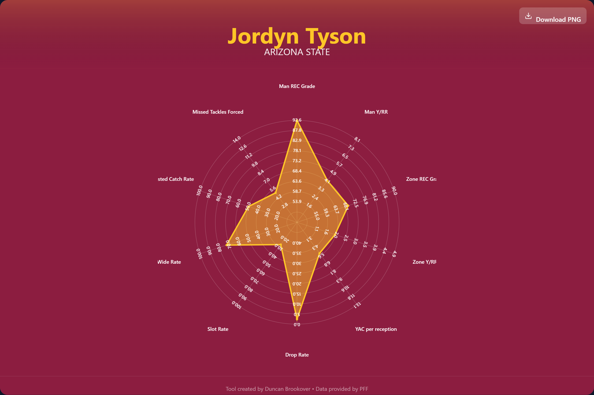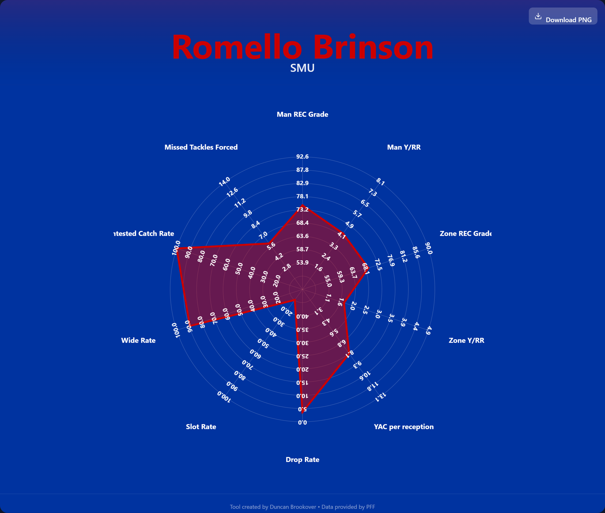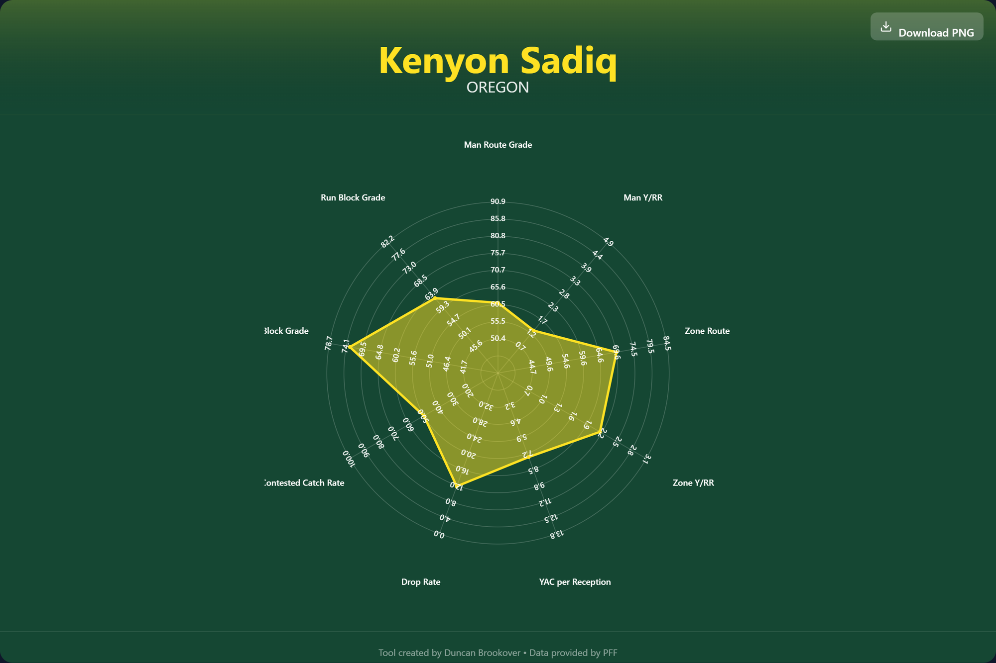 I have been waiting for this moment for a while, where it seems like two things are finally coming together. 1.) We finally have enough games under our belt to begin to draw data driven conclusions on how some prospects look this year. 2.) I have built a tool that makes the process of making radar charts quicker, and more accessible to all! You do need access to PFF premium data for it to work properly, so if you do feel free to check it out.