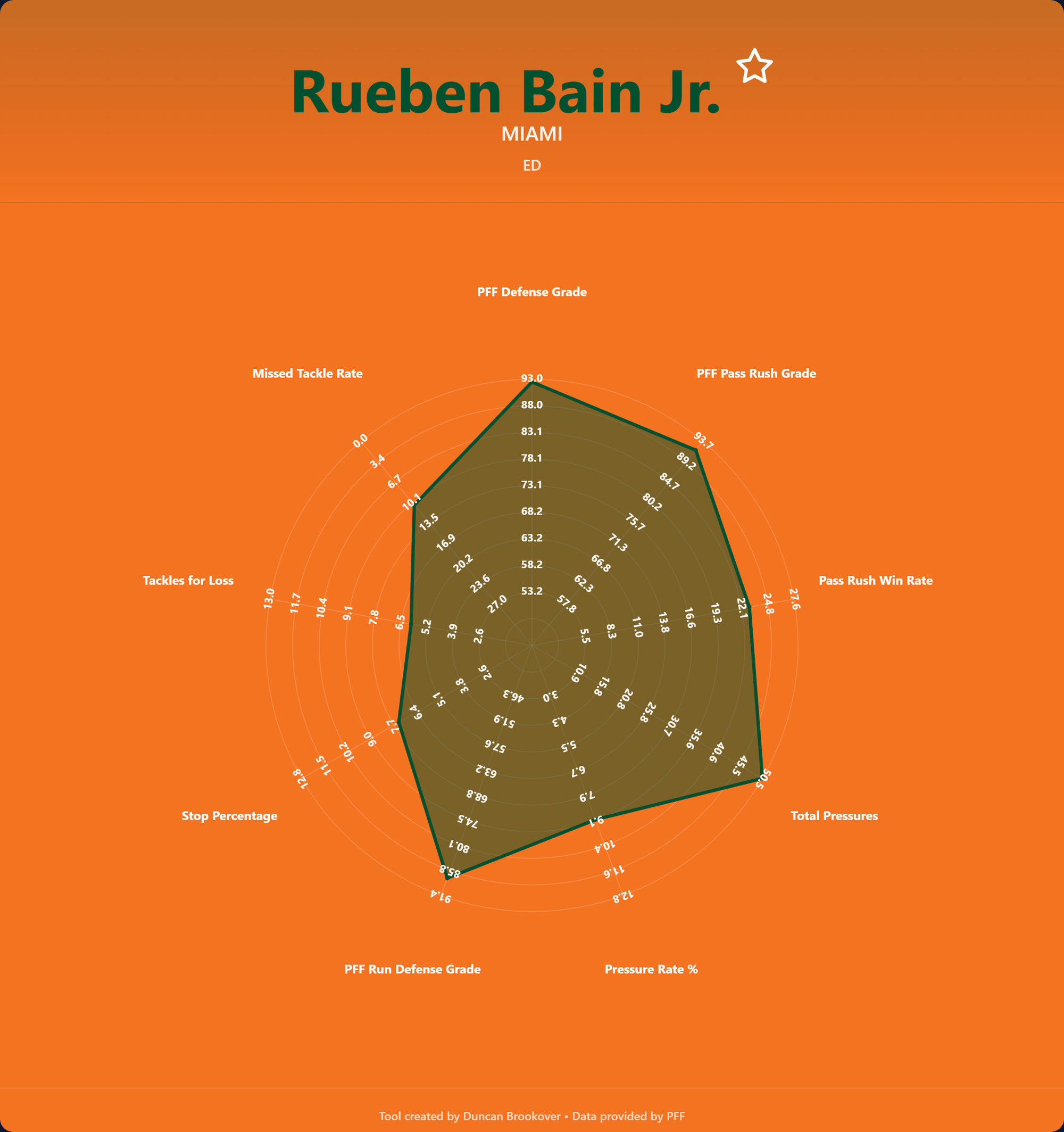 Rueben Bain Jr. grew up in a South Florida family steeped in football. His grandfather Herman played three sports at Northwestern High School in the 1960s, his father Rueben Sr. was a two-way lineman at Carol City and Morris Brown College, and cousin Tolbert was part of Miami's 1987 national championship team. Tolbert used to bring young Rueben to campus for youth camps under Mark Richt, and the family nickname "Hurricane" was passed from father to son on the field. Bain Jr. attended Miami Central, one of Florida's premier football pipelines, won four consecutive 5A state championships, and accumulated 77 career sacks. Despite tearing his MCL in his junior year's title game, he still managed 29.5 sacks the next season, securing the Nat Moore Trophy for top South Florida player and an invitation to the Under Armour All-America Game. He chose Miami over Alabama, Georgia, and LSU, citing his mother, Lachande, who never missed a game, and his desire to give back to his community. He became a starter by week three of his freshman year in 2023 when Akheem Mesidor was injured, led all FBS defensive linemen with 7.5 sacks, won ACC Defensive Rookie of the Year. In 2025, Bain won the Ted Hendricks Award, the ACC Defensive Player of the Year award, and earned consensus All-American honors before declaring for the 2026 NFL Draft.