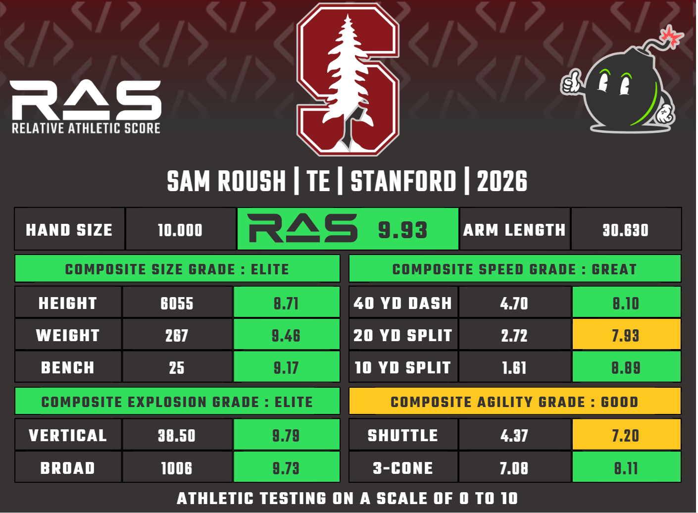 That is the highest in the class and the 11th-ranked TE RAS of all time. Everything on the field looks just as good. The way he moves out there, he looks more like a WR sometimes. Has random T-Rex arms, but it did not seem to affect his play.