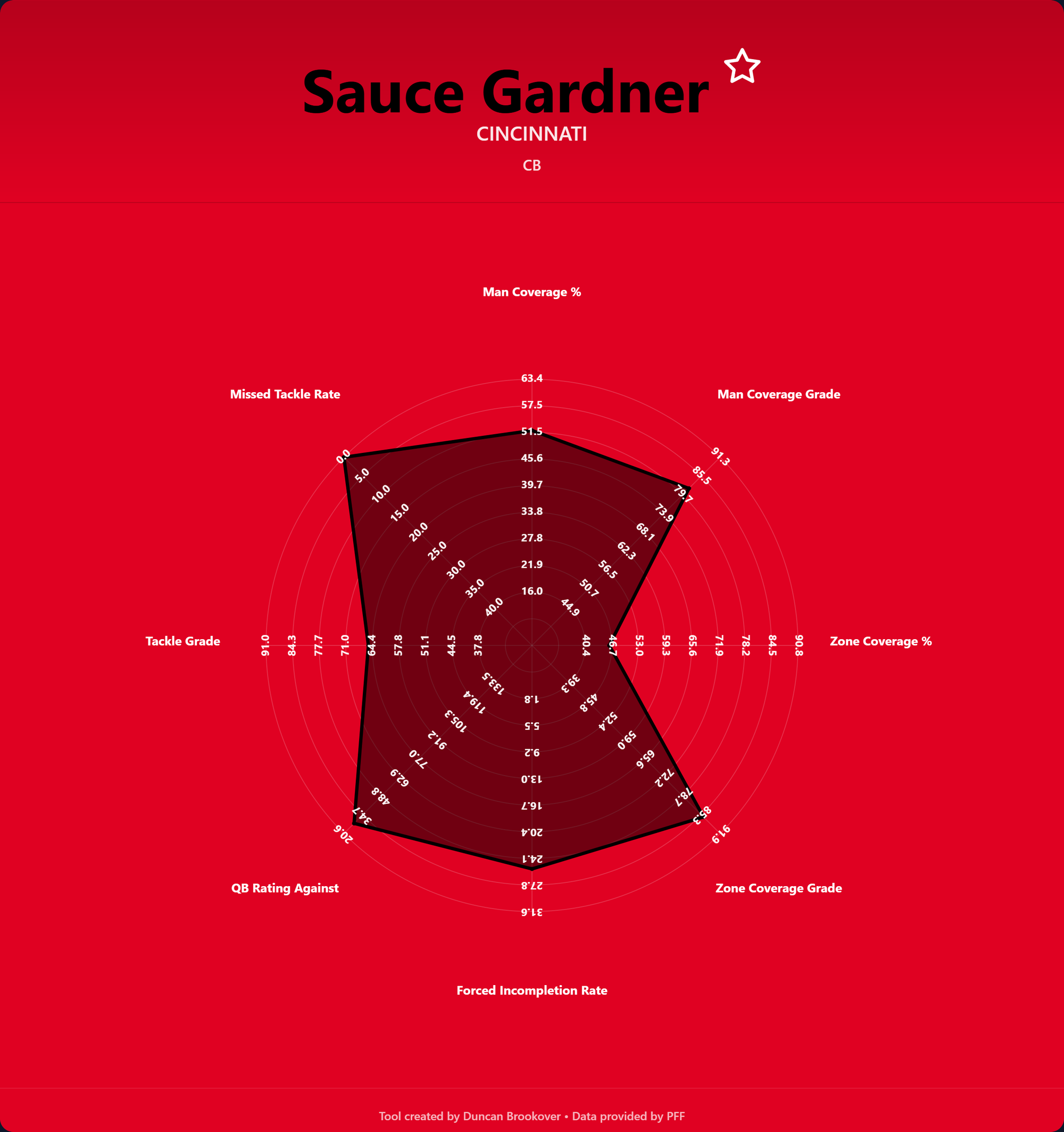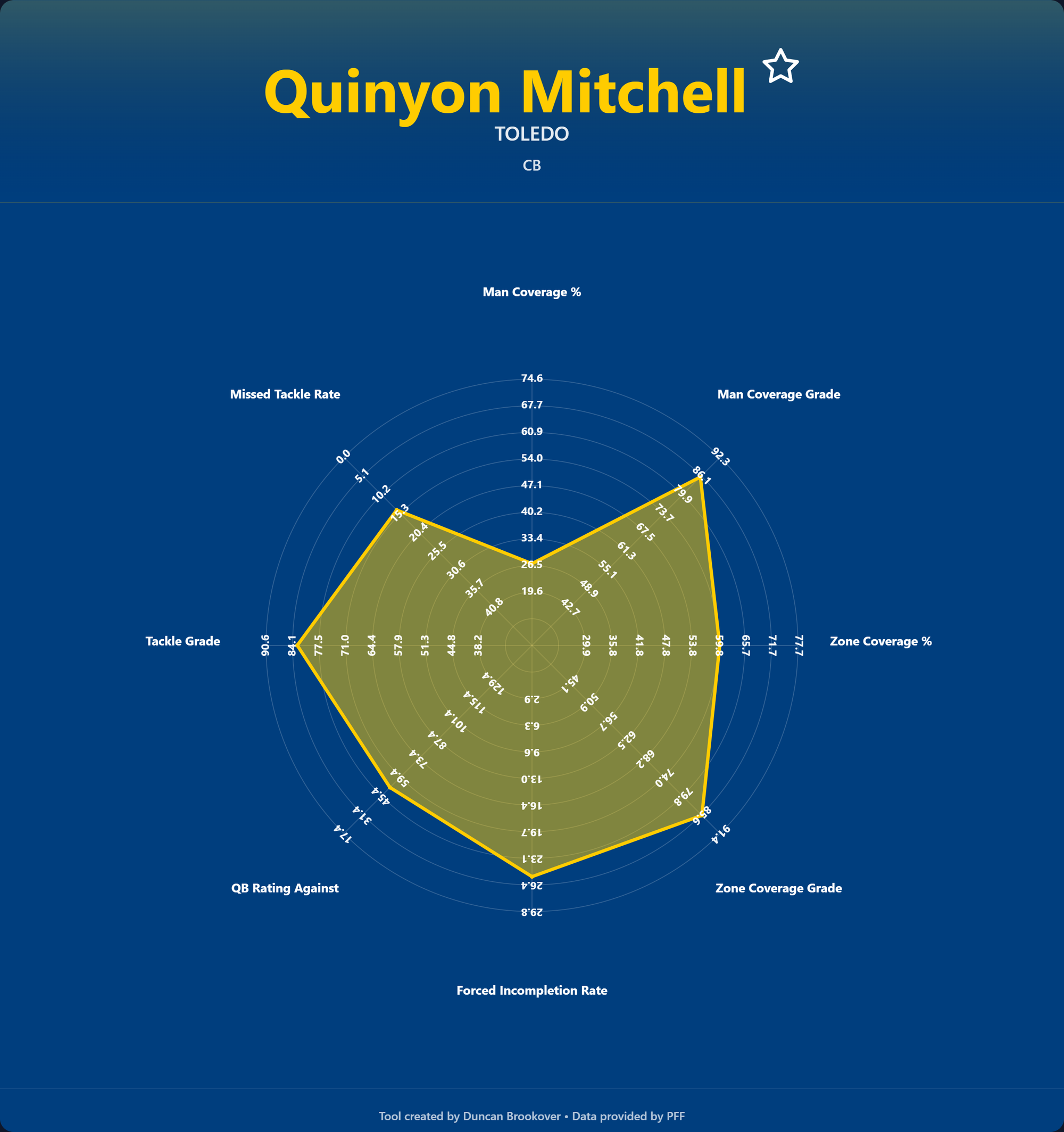 Radar charts give a quick and easy look at the kind of player you are looking for. The statistics represent different CB archetypes. Do you have a man coverage specialist, a zone coverage specialist, or an all-rounder? Does the CB play a high or low variance game?