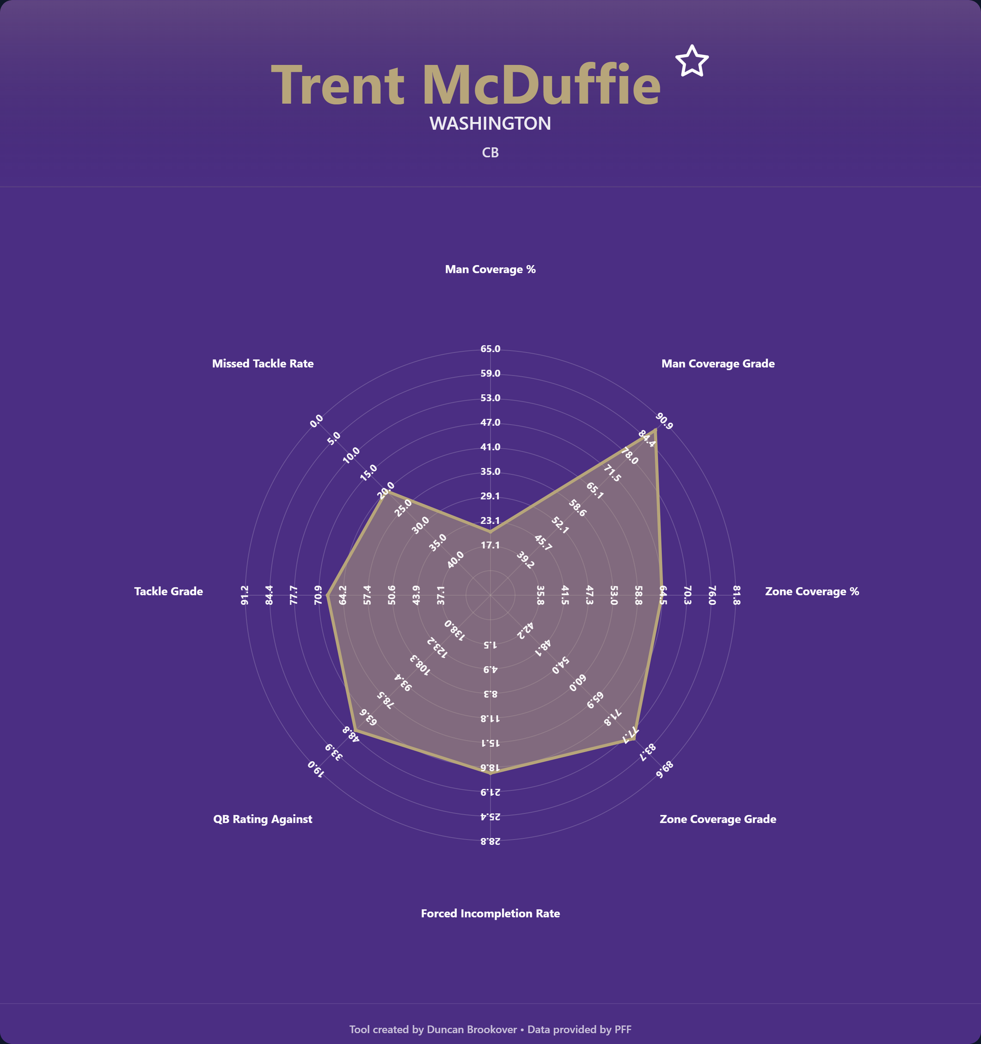 - Man Coverage Grade – A proprietary PFF rating evaluating a cornerback's effectiveness in man coverage — mirroring routes, maintaining leverage through breaks, and contesting at the catch point.