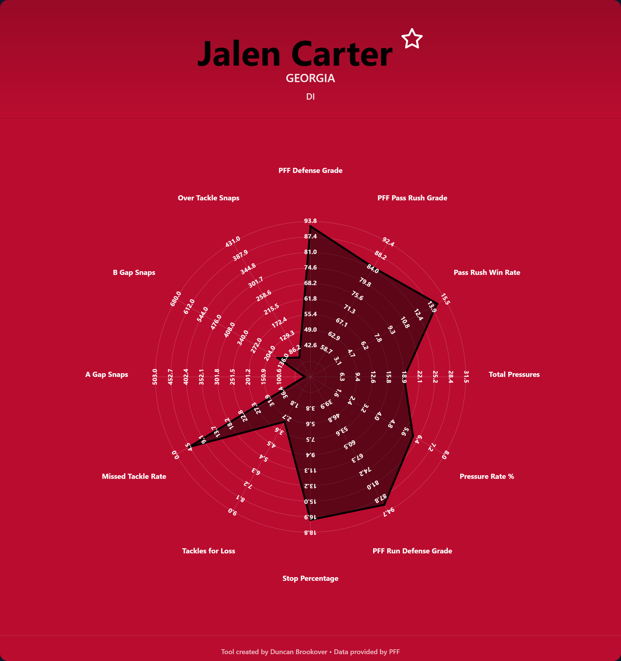 - PFF Defense Grade – A proprietary PFF rating capturing an interior defensive lineman's overall contribution across all play types.