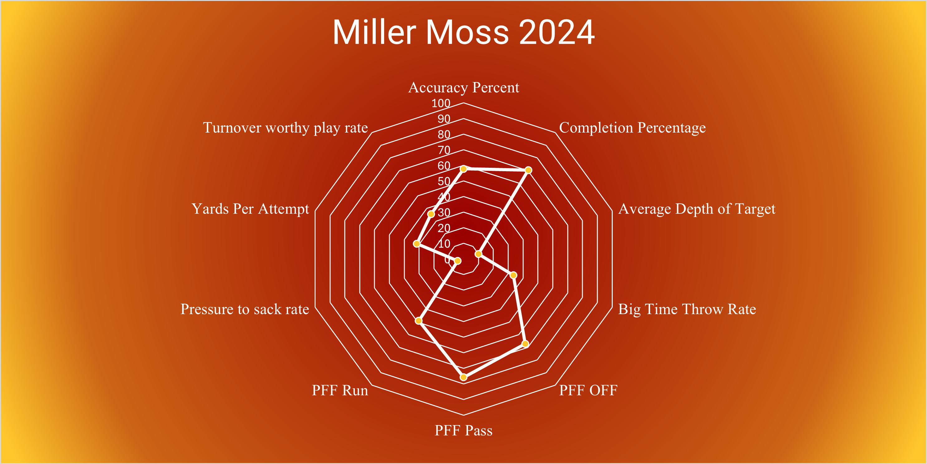 There’s something here. That radar chart does not look like anything special, but if you squint at the tape, you can see some traits that could make him a solid NFL player. Does not put the ball in trouble’s way, and has a very solid pocket presence. Those traits can be the building blocks of very good QB play. Add in some excellent throws that put his receivers in positions to win, and if he gets a bit more consistent, he could be a dark horse to move up boards. And that would not be too surprising given that he will play at Louisville under Jeff Brohm, who just did that for Tyler Shough.